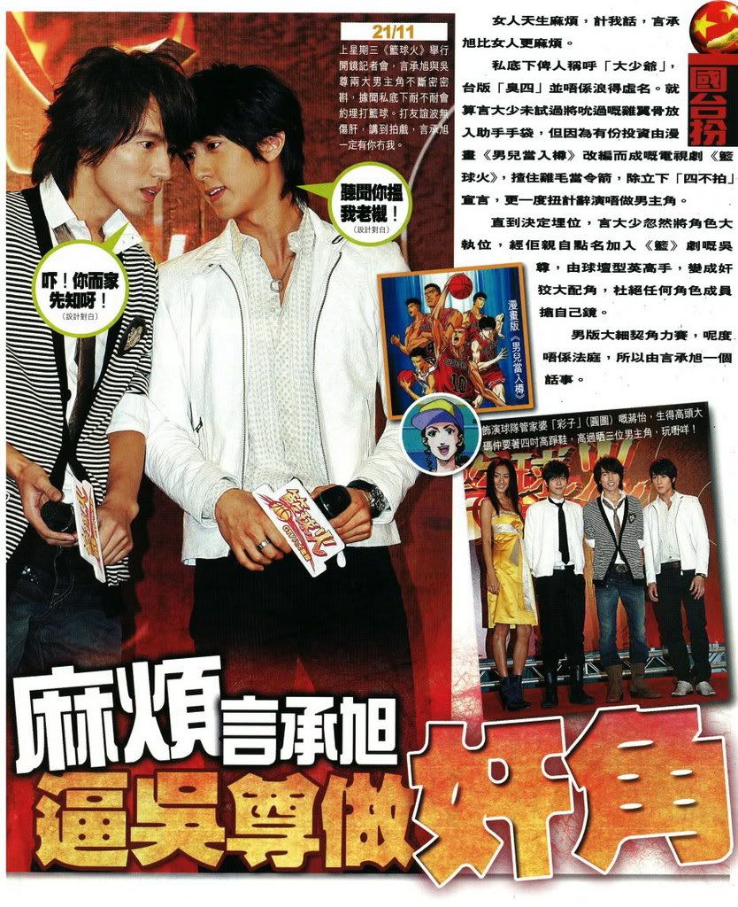 集 合 中 、 港 、 台 三 地 資 金 , 預 計 耗 資 7,000 萬 台 幣 ( 約 1,500 萬 港 元 ) 拍 攝 電 視 劇 《 籃 球 火 》 , 劇 本 由 漫 畫 《 男 兒 當 入 樽 》 改 編 而 成 , 由 於 言 承 旭 有 份 俾 錢 投 資 , 第 一 男 主 角 「 櫻 木 花 道 」 , 順 理 成 章 由 佢 擔 正 。